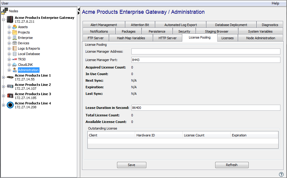 License Pooling(许可证池)选项卡用于配置许可证管理器功能或许可证客户端功能,并查看节点上的许可证池信息。